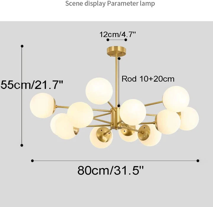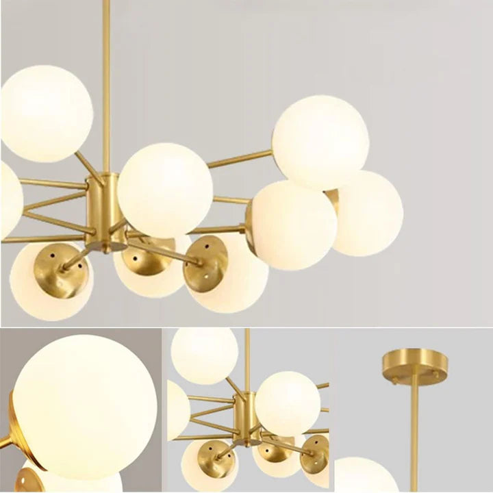To, co wyróżnia tę plafonierę z 12 szklanymi kulami, to jej wszechstronność – można ją zamontować bezpośrednio przy suficie albo delikatnie zawiesić dzięki złotemu prętowi dołączonemu do zestawu.